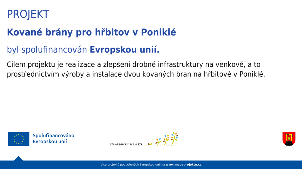 Předmětem projektu je obnova zeleně a pěších komunikací na veřejném prostranství hřbitova obce Poniklá. Realizace projektu přispěje ke zlepšení životního prostředí na území národních parků a kvality života občanů v obcích, které leží na území národních parků a udržitelného rozvoje těchto obcí.