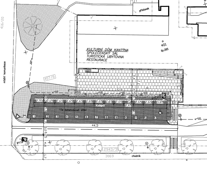 Nové parkoviště pro 13 vozidel, jakož i úprava prostranství před kulturním domem probíhá v režii firmy pana Stránského. Projekt je podpořen 85% dotací z programu podpory obcí ležících v národním parku.