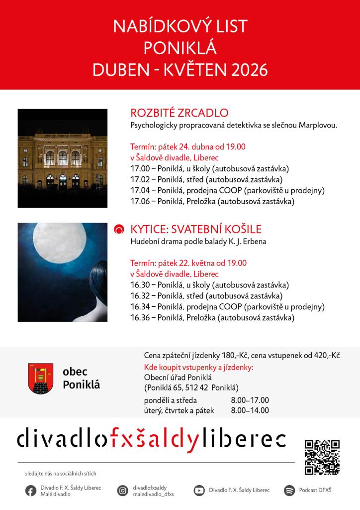 s dopravou z a do Poniklé !!! Oproti plakátu budou ceny příznivější: Rozbité zrcadlo 300 Kč vstupenka a 180 Kč cesta; Svatební košile 350 Kč vstupenka a 180 Kč cesta